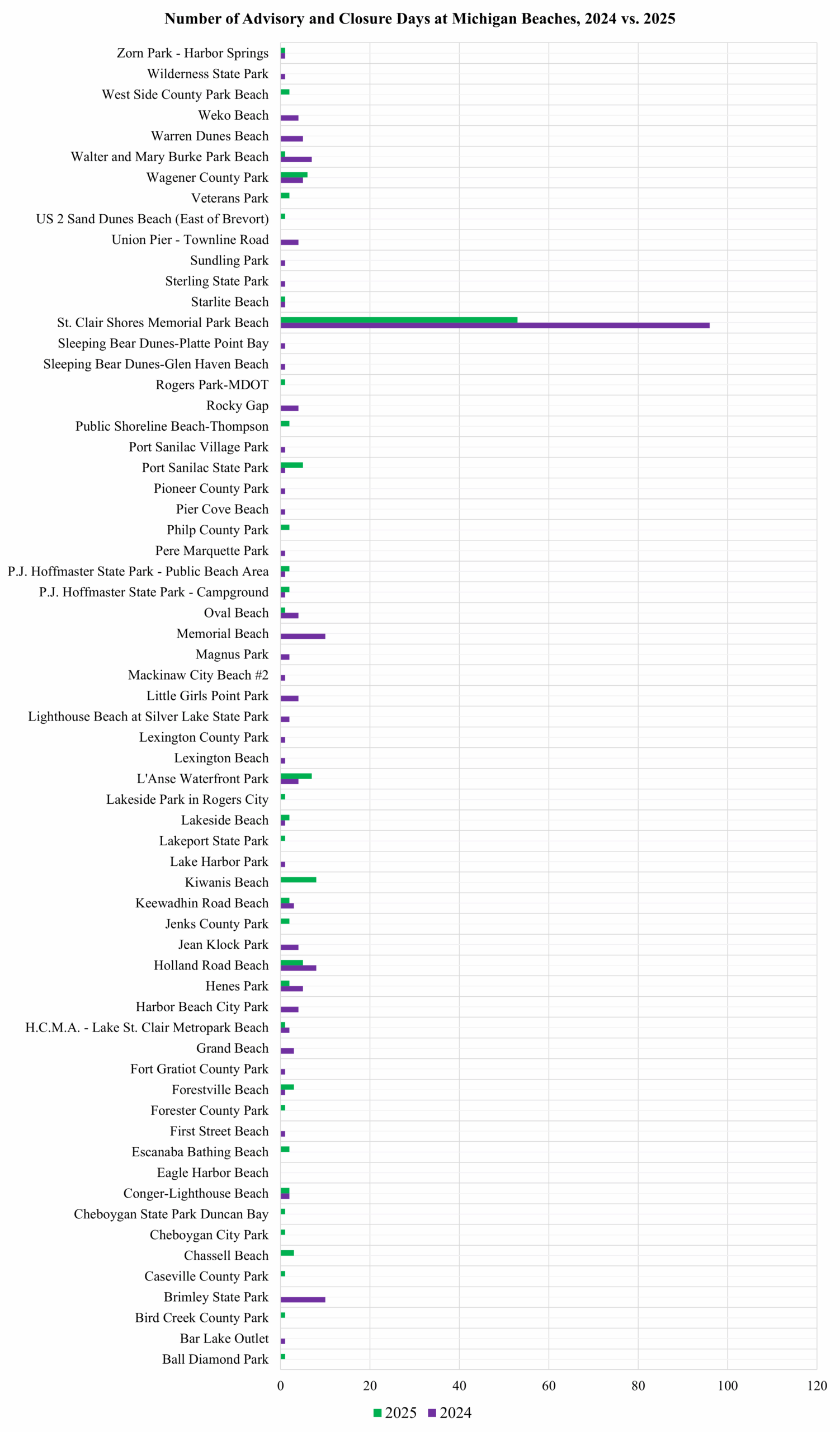 Other beaches such as Holland Road Beach, Wagener County Park, and L’Anse Waterfront Park recorded modest totals across both years, rarely rising above ten days annually. For the most part, Michigan’s closures and advisories are not broadly distributed but are instead concentrated in a small set of locations, with St. Clair Shores being by far the most significant. The downward trend in 2025 is therefore encouraging, but we hope this site can maintain improvements.