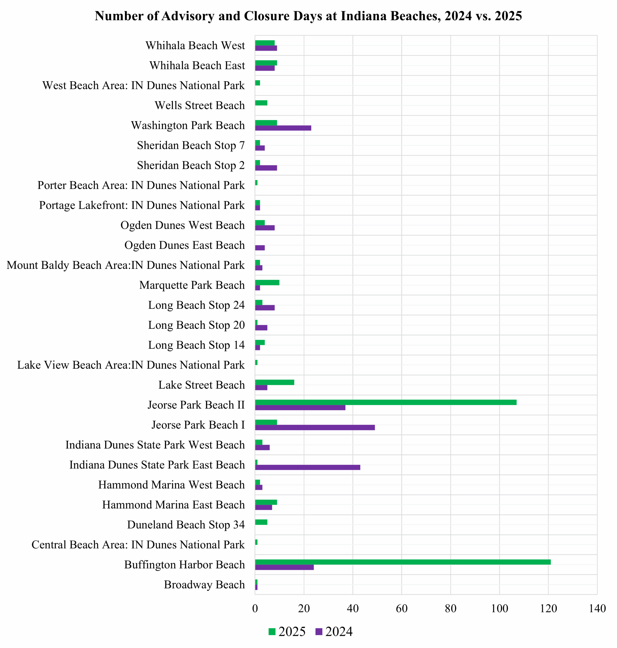 Indiana tells a more complicated story. Overall, closure/advisory days increased from 262 in 2024 to 340 in 2025, an additional 78 days. But the numbers conceal stark contrasts between individual beaches.