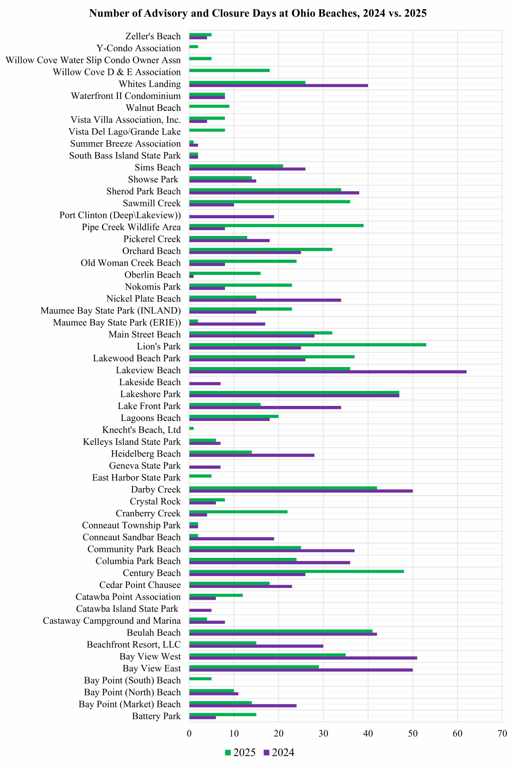 The burden of closures/advisories in Ohio is also more widely distributed across beaches than in the other states. Lakeview Beach, Lakeshore Park, Darby Creek, Bay View West and East, Beulah Beach, Lion’s Park, Sherod Park Beach and Century Beach each accounted for more than 70 closure/advisory days across the two years. Many other beaches fell in the range of 30 to 60 days. Unlike Michigan, where closures/advisories are concentrated at one site, Ohio’s problem is systemic, with high closure/advisory levels spread across dozens of locations.