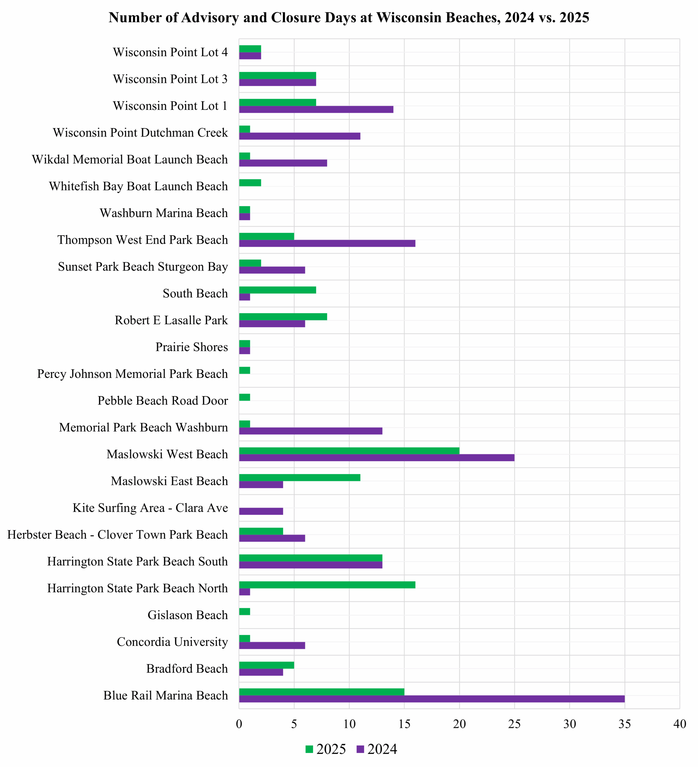 There were also notable year-to-year shifts. Some beaches improved dramatically: Blue Rail Marina dropped from 35 days in 2024 to 15 in 2025, Thompson West End Park Beach from 16 to five, and Memorial Park Beach Washburn from 13 to just one. Other locations remained steady, such as Harrington State Park Beach South (13 days in each year) and Wisconsin Point Lot 3 (seven days in each year). A few beaches worsened, most strikingly Harrington State Park Beach North, which rose from a single day in 2024 to 16 days in 2025.