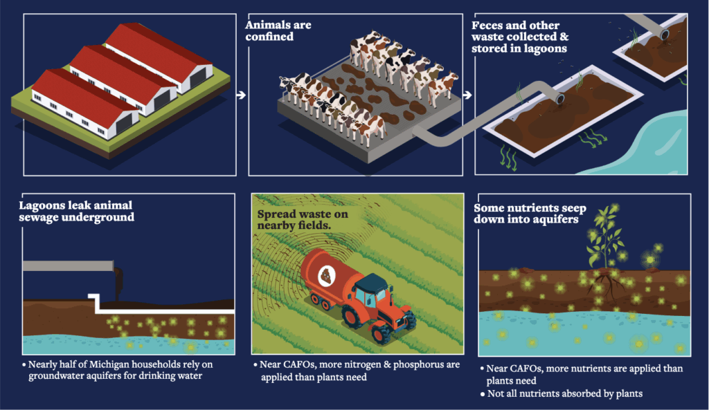Diagram shows one way that nitrates from animal sewage can contaminate waterways. Click to expand.