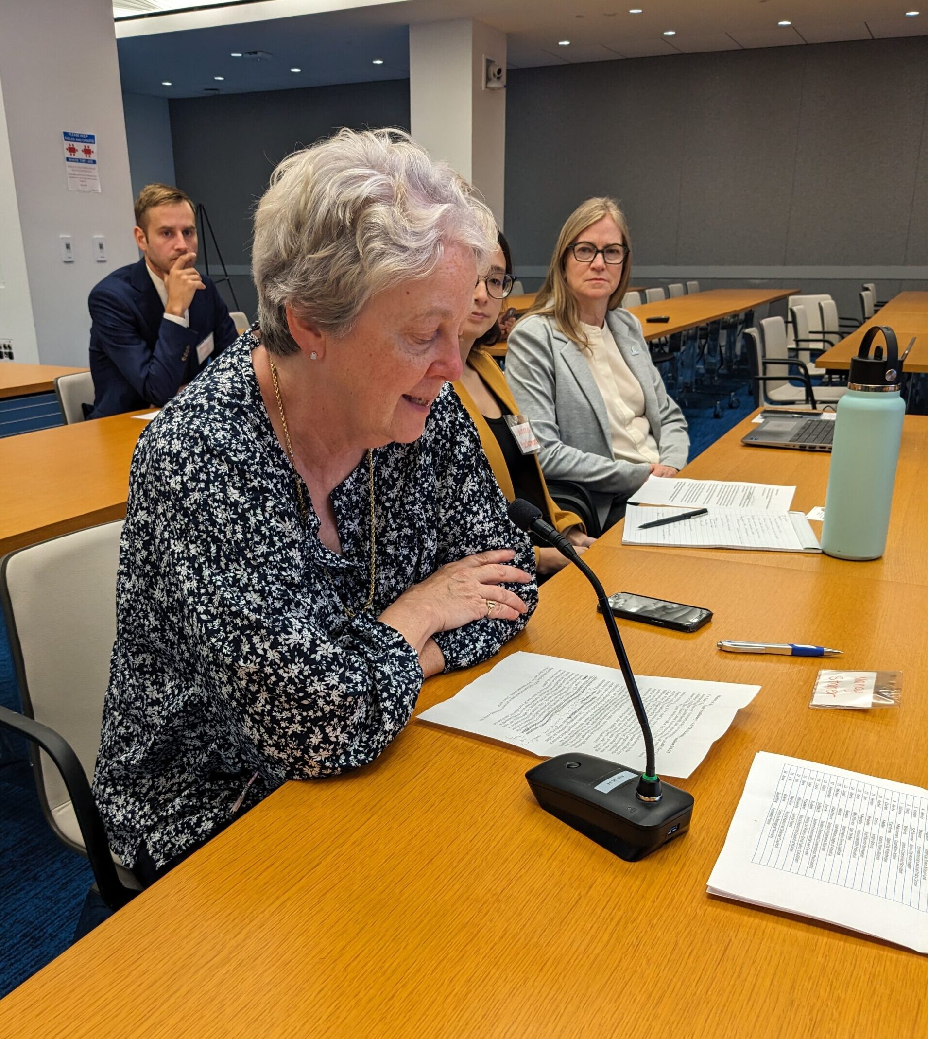 ELPC Senior Attorney Nancy Stoner sits at a large wooden table with other people, testifying into a microphone as she reads from a paper